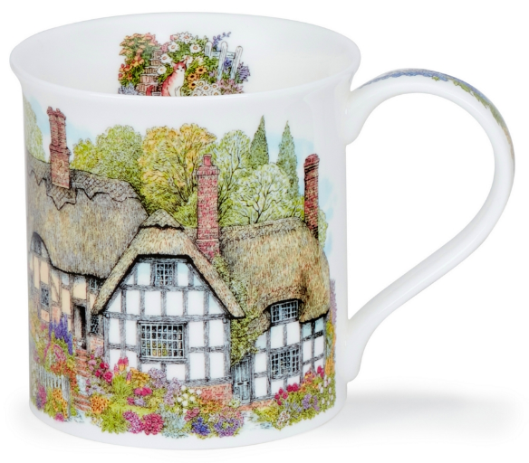 Sue Scullard's amazingly fine, detailed illustrations of idyllic country cottages are a fabulous addition to any traditional mug collection. This design features Tudor style, thatched cottages in a rural setting.