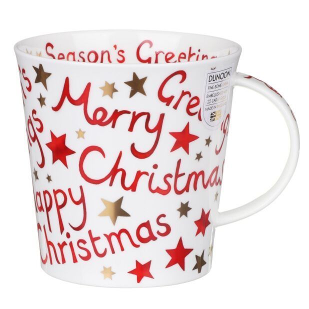 Merry Christmas! Send your christmas greetings with this lovely mug designed by Caroline Bessey with bright red lettering and radiant stars of 22 carat gold