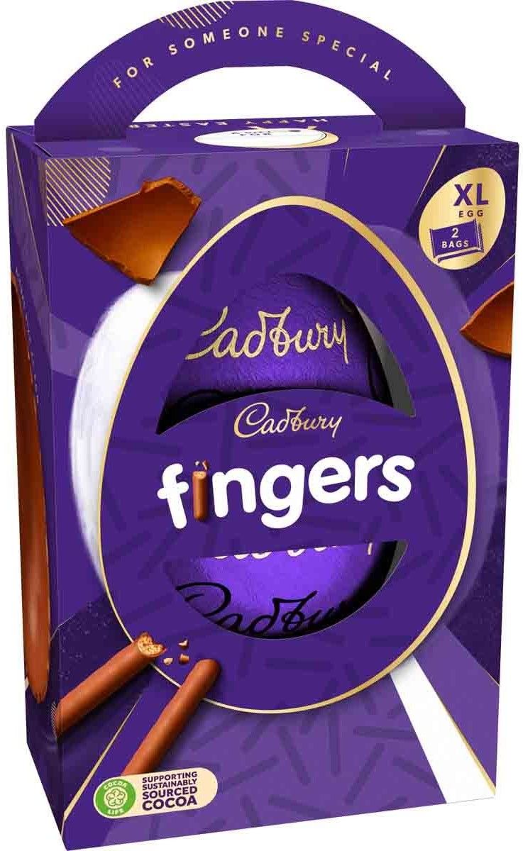 Giant hollow egg with two bags of crisp biscuit mini Cadbury Fingers.