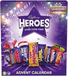 A Heroes Christmas Advent-Ure Calendar. Open a little door each day in your countdown to Christmas to find a Heroes chocolate - it may be Creme Egg twisted, Wispa, Twirl, Dairy Milk Caramel, Dairy Milk, Fudge, Crunchie Bits, Dinky Decker and Cadbury chocolate Eclairs