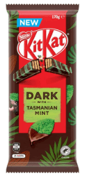 NESTLE KITKAT Dark Tasmanian Mint Chocolate Block contains wafer fingers covered in delicious swirls of rich dark chocolate and refreshing mint choc made with/flavoured using oil from mint grown in the beautiful state of Tasmania.
