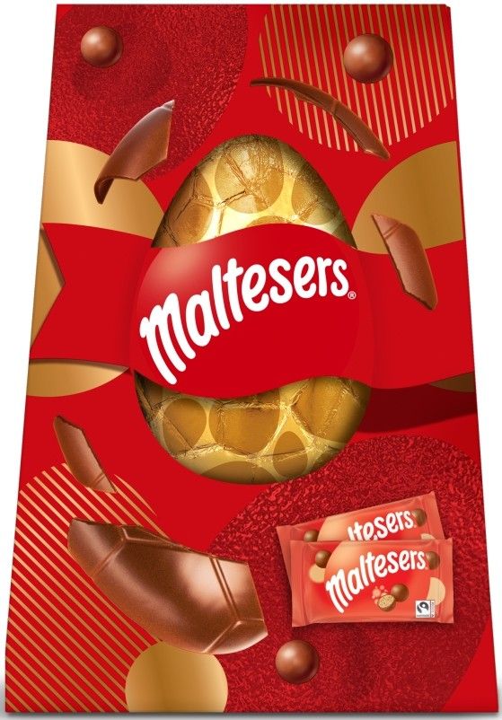 A hollow milk chocolate egg with 2 full size bags of Maltesers