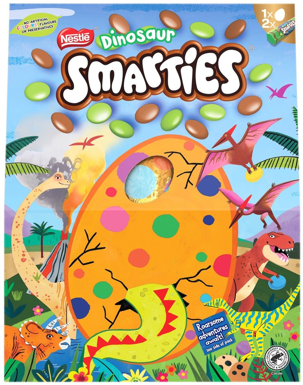 SMARTIES Dinosaur Giant Egg is a smooth milk chocolate egg with three full-sized Smarties Tubes included, dino-style!