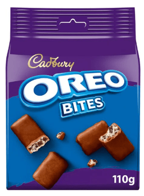 Cadbury Dairy Milk Oreo Bites bag. Delicious cream-filled Oreo cookie pieces smothered in smooth Cadbury milk chocolate perfect for an afternoon treat! Approx 20 Chocolates in each bag. weight 110g