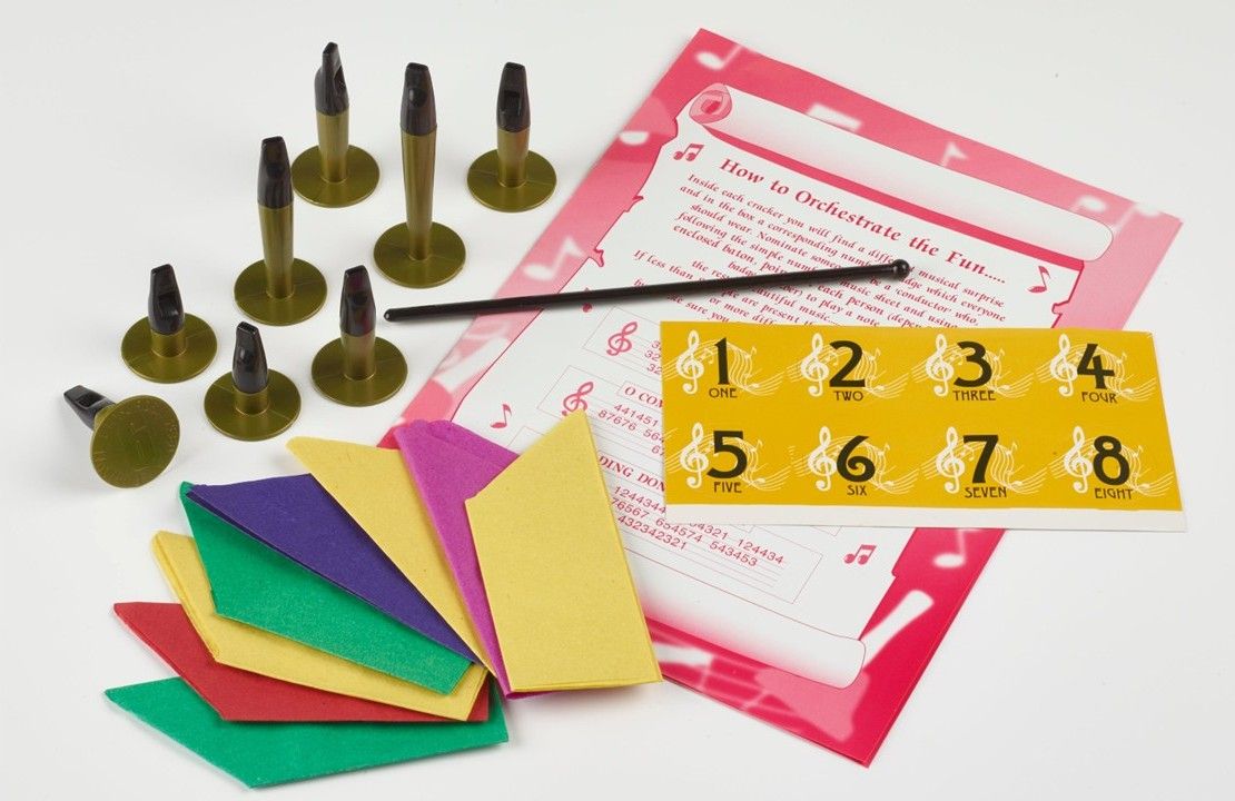 HOW TO ORCHESTRATE THE FUN - Inside each handmade cracker you will find a different musical whistle and a numbered badge which everyone should wear. Nominate someone to be the conductor who, following the simple numbered music sheet and using the enclosed baton, points at each person (depending on their badge number) to blow their whistle - the result: beautiful music....or total chaos ! If less than 8 people are present then some will need to have 2 or more different whistles to blow - but make sure you blow the right one at the right time!