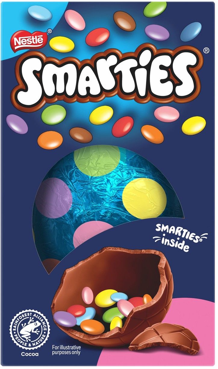 Milk chocolate egg containing Smarties.
